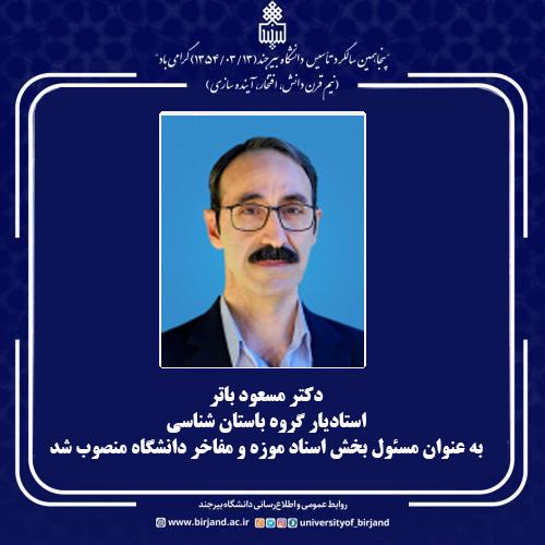 دکتر مسعود باتر، استادیار گروه باستان شناسی، به عنوان مسئول بخش اسناد و مفاخر دانشگاه منصوب شد.