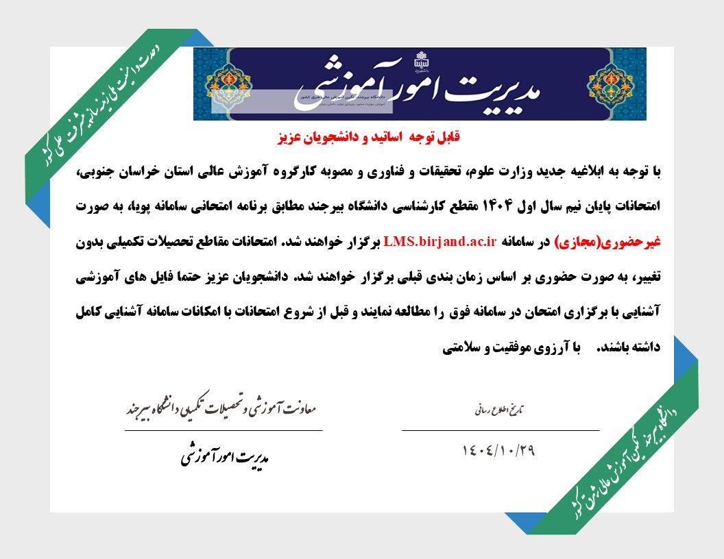 قابل توجه دانشجوان گرامی! ضمن عرض خسته نباشید به اطلاع می رساند، طبق...