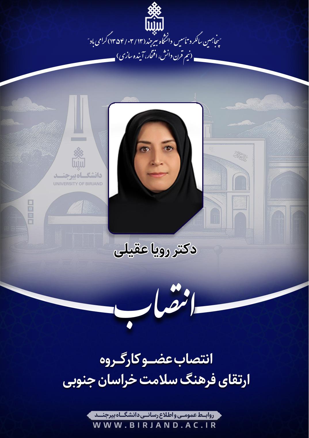 دکتر محمود گنجیفرد، رئیس دانشگاه علوم پزشکی و خدمات بهداشتی و درمانی با صدور ابلاغی، دکتر رؤیا عقیلی، رئیس اداره بهداشت و درمان دانشگاه را به عنوان عضو کارگروه ارتقای فرهنگ سلامت استان خراسان جنوبی منصوب کرد.