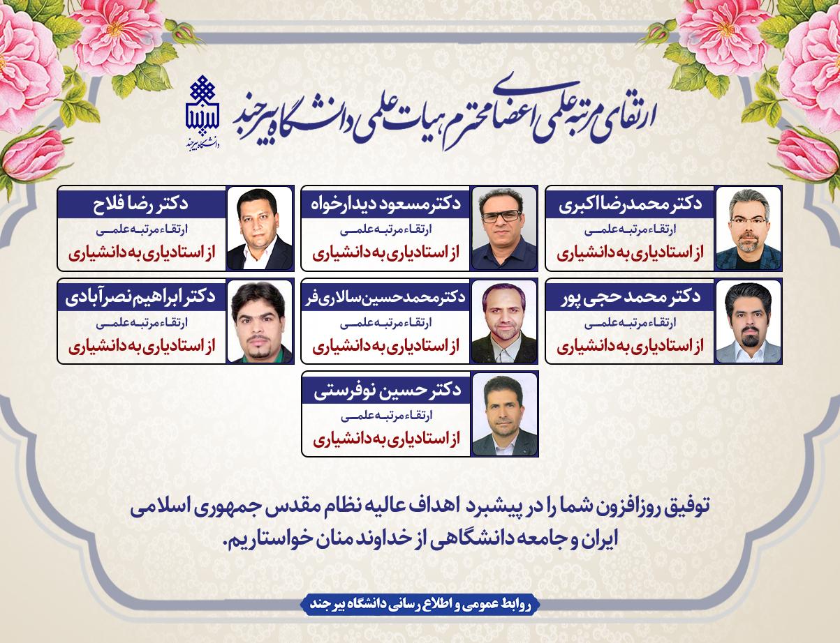 روابط عمومی و اطلاعرسانی دانشگاه بیرجند ضمن تبریک به جامعه دانشگاهی، از خداوند متعال برای این اساتید محترم و فرهیخته آرزوی توفیق روز افزون و تداوم موفقیتها در کسب درجات علمی بالاتر را خواستار است.