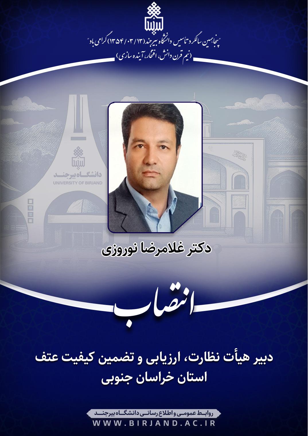 به گزارش روابط عمومی و اطلاع‌رسانی دانشگاه بیرجند، در این حکم انتصاب آمده است؛ بـا عنـایت به پیشـنهاد رئیس محترم دانشگاه بیرجنـد و رئیس هیئت نظارت، ارزیابی و تضمین کیفیت استان خراسان جنوبی و با استناد به آیین نامه نظام نظارت، ارزیابی و