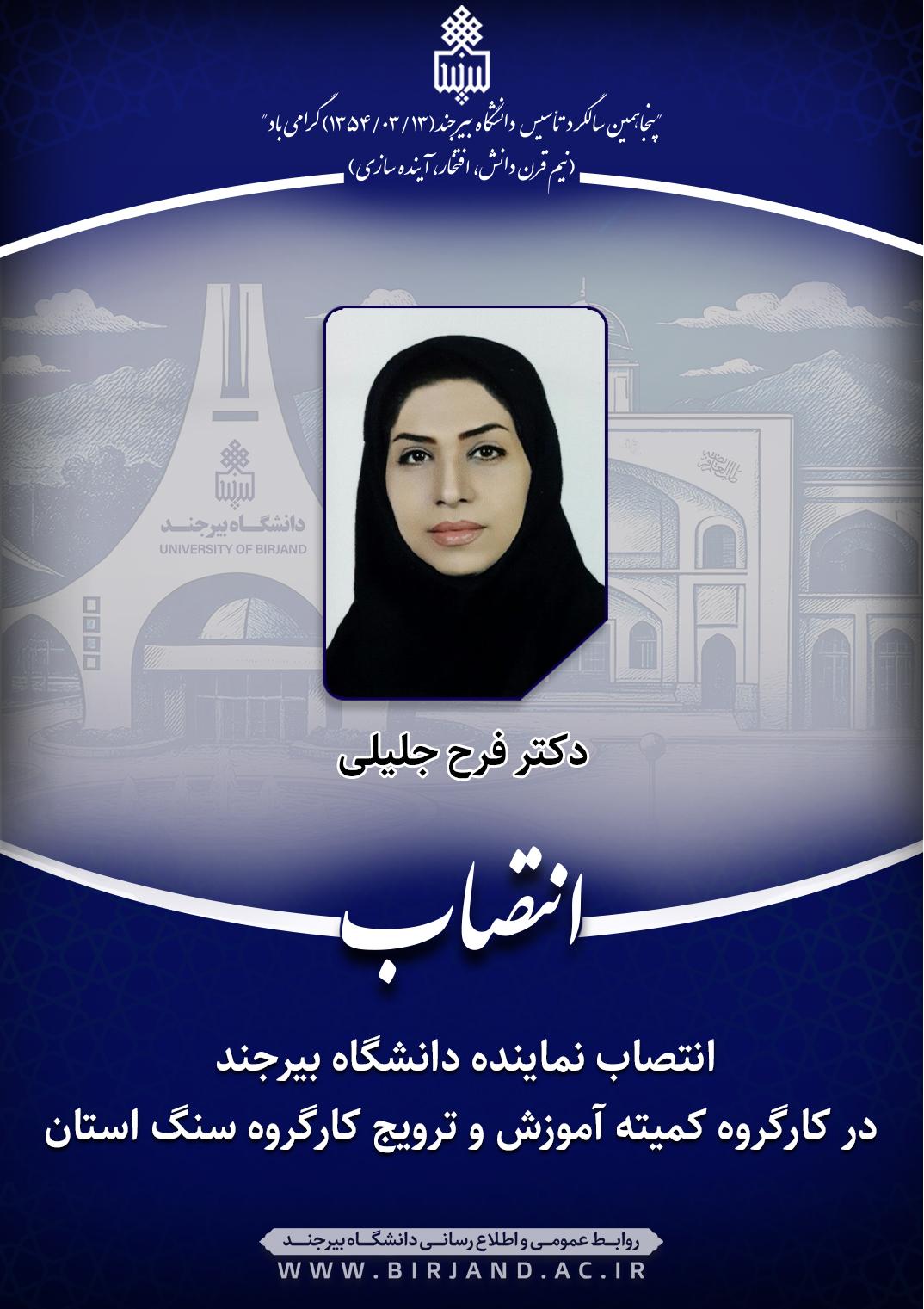 به گزارش روابط عمومی و اطلاعرسانی دانشگاه بیرجند، در ابلاغ انتصاب صادره از سوی حسن کامرانیفرد، مدیرکل آموزش فنی و حرفه ای استان به دکتر فرح جلیلی آمده است؛ با عنایت به برگزاری جلسه کمیته آموزش و ترویج ذیل کارگروه کمیتههای تخصصی سنگهای قیمتی و نیمهقیمتی استان، بدینوسیله جنابعالی به عنوان عضو" کمیته آموزش و ترویج کارگرو سنگ استان" به مدت یکسال منصوب می گردید. امید است با بهره مندی از توان علمی و تخصصی جنبعالی شاهد ارتقا هرچه بهتر این کمیته باشیم.