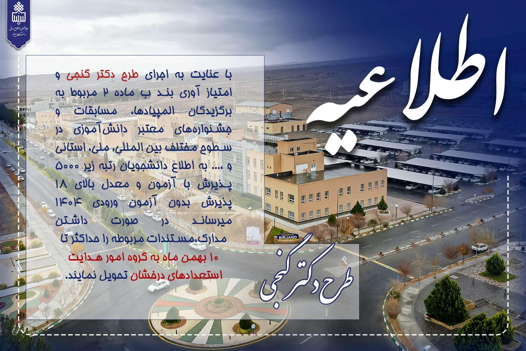 به گزارش روابط عمومی و اطلاع‌رسانی دانشگاه بیرجند، با عنایت به اجرای طرح دکتر گنجی و امتیازآوری بند «ب» ماده ۲ مربوط به برگزیدگان المپیادها، مسابقات و جشنواره‌های معتبر دانش‌آموزی در سطوح بین‌المللی، ملی و استانی، از دانشجویان واجد شرایط دعوت می‌شود نسبت به تکمیل و ارائه مدارک اقدام کنند.