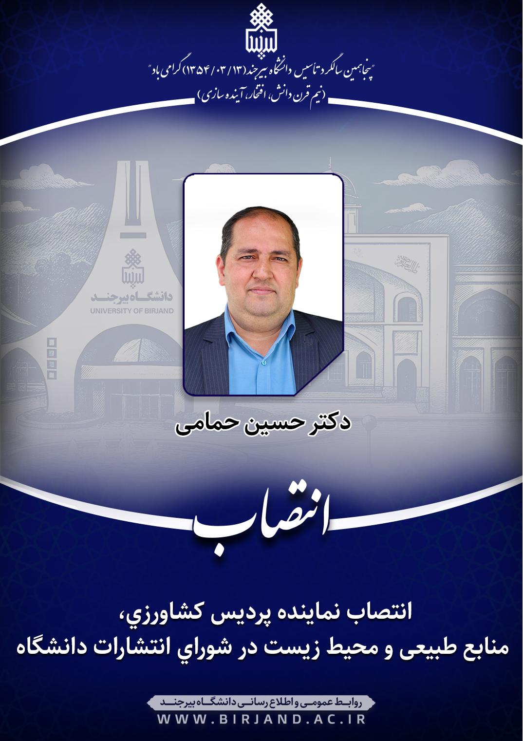 دکتر احمد خامسان، سرپرست دانشگاه بیرجند، طی ابلاغی، دکتر حسین حمامی، عضو هیأت علمی گروه آموزشی مهندسی تولید و ژنتیک گیاهی را به عنوان نماینده پردیس کشاورزی، منابع طبیعی و محیط زیست در شورای انتشارات دانشگاه به مدت دو سال منصوب کرد.