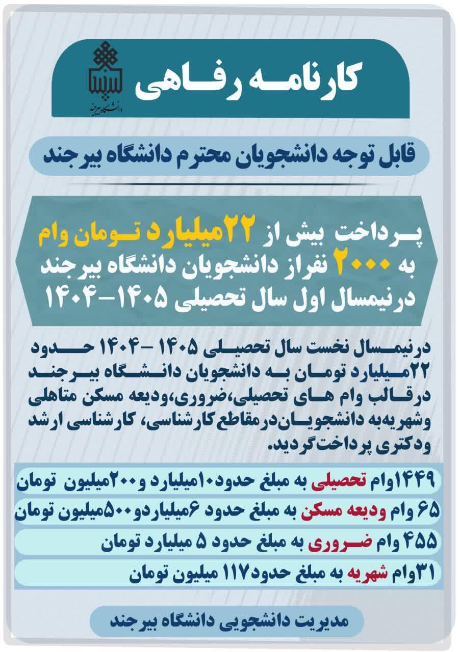 به گزارش روابط عمومی و اطلاعرسانی دانشگاه بیرجند، دکتر سامان فرزین، مدیر دانشجویی دانشگاه بیرجند، با اعلام خبر پرداخت بیش از ۲۲ میلیارد تومان وام دانشجویی در نیمسال نخست سال تحصیلی ۱۴۰۵–۱۴۰۴ ، گفت: هدف از پرداختها این وامها حمایت از دانشجویان و کاهش دغدغههای معیشتی آنان است. وی افزود در نیمسال اول سال تحصیلی جاری، حدود ۲ هزار نفر از دانشجویان دانشگاه از انواع وامهای دانشجویی بهرهمند شدهاند و مجموع پرداختها به بیش از ۲۲ میلیارد تومان میرسد.