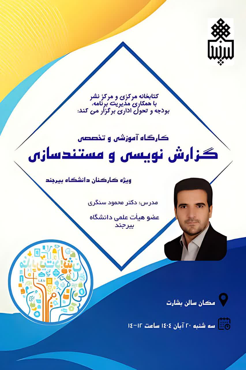 کارگاه آموزشی و تخصصی گزارش نویسی و مستندسازی ویژه کارکنان دانشگاه بیرجند روز سه شنبه 20 ابان 1404 ساعت 12-14 در محل سالن بشارت برگزار خواهد شد.