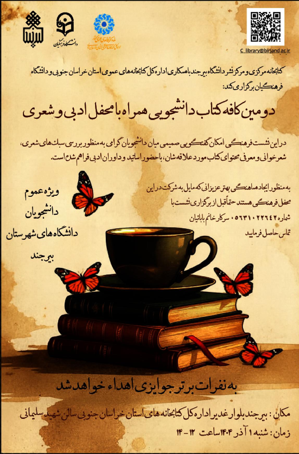 دومین کافه کتاب دانشجویی همراه با محفل ادبی و شعری ویژه عموم دانشجویان دانشگاه های شهرستان بیرجند