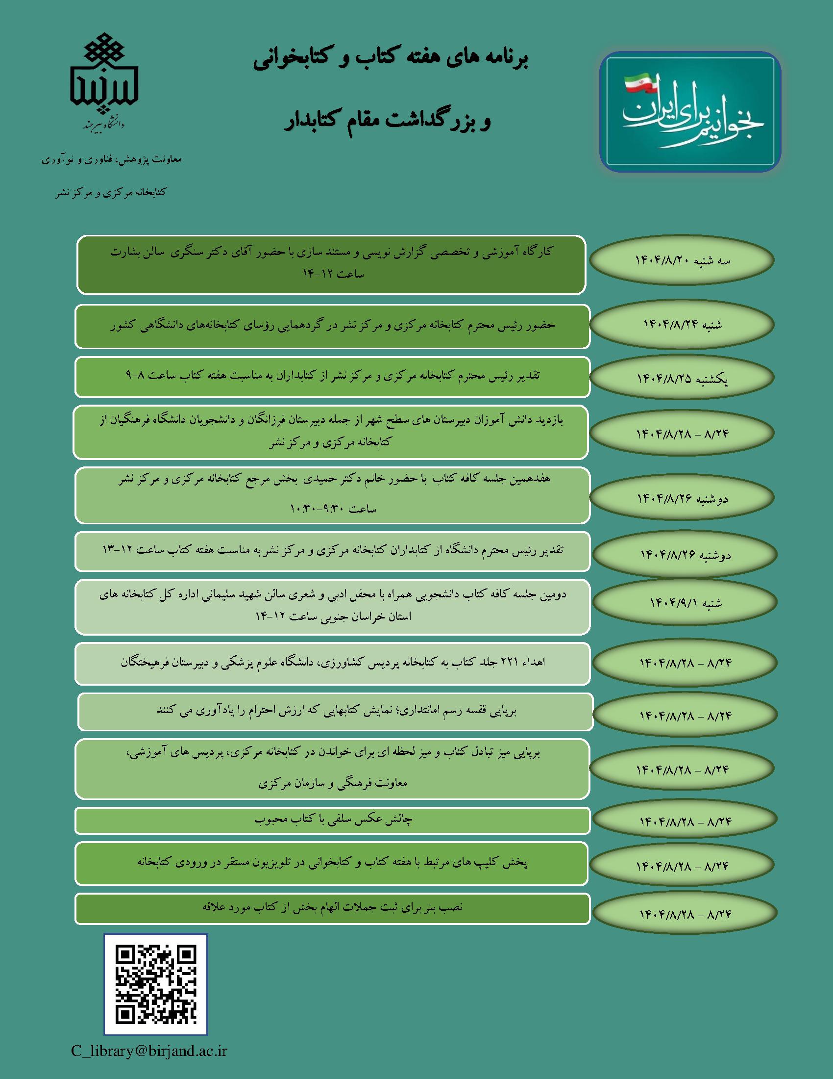 اینفوگراف برنامه های هفته کتاب و کتابخوانی و بزرگداشت مقام کتابدار ۲۷ آبان ۱۴۰۴ | ۱۳:۱۰ کد : ۳۲۵۵۷ اخبار اطلاعیه ارسال به دیگران نام شما ایمیل شما ایمیل دریافتکننده ارسال انصراف تعداد بازدید:۵۱