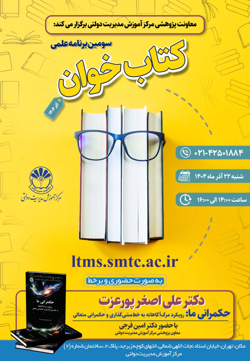 مرکز آموزش مدیریت دولتی در راستای گسترش فرهنگ مطالعه علمی میان مدیران و اندیشمندان در نظر دارد سومین برنامۀ علمی »کتابخوان« را در روز شنبه ۲۲ آذرماه ،۱۴۰۴ از ساعت ۱۴:۰۰ تا ۱۶:۰۰ به صورت حضوری و برخط در محل سالن ولایت مرکز آموزش مدیریت دولتی به نشانی: "تهران، خیابان کریم خان زند، خیابان استاد نجات الهی شمالی، انتهای کوچه زبرجد، پلاک ۲" برگزار نماید. محور این برنامۀ علمی بررسی اثر ارزشمند "حکمرانی ما: رویکرد مرگ آگاهانه به خط مشی گذاری و حکمرانی متعالی" تألیف دکتر علی اصغر پورعزت میباشد.