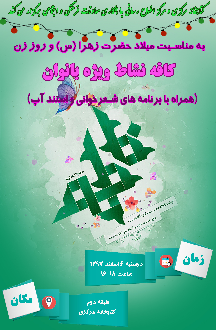 به مناسبت ولادت حضرت زهرا (س) و روز زن برنامه کافه نشاط در کتابخانه مرکزی برگزار شد. گالری ۰۷ اسفند ۱۳۹۷ ادامه مطلب