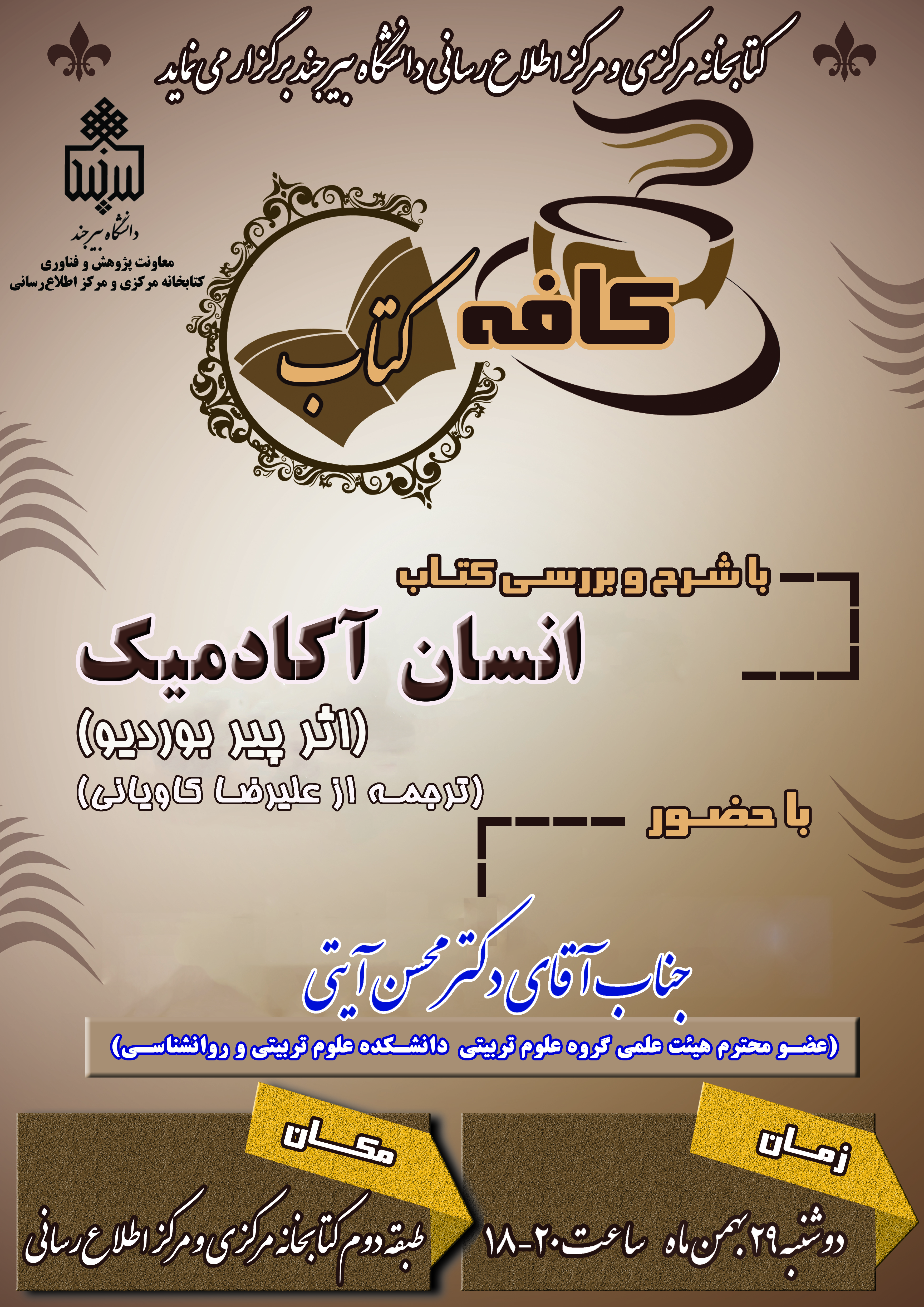سومین نشست کافه کتاب با شرح و بررسی کتاب "انسان آکادمیک" و با حضور "آقای دکتر محسن آیتی" برگزار می شود. ۲۴ بهمن ۱۳۹۷ ادامه مطلب