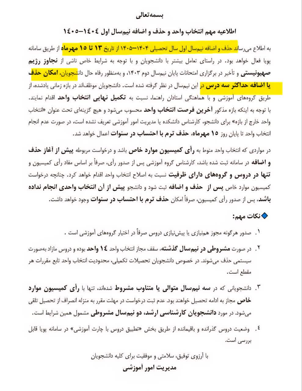 اطلاعیه حذف و اضافه نیمسال اول ۱۴۰۵-۱۴۰۴ ۱۳ مهر ۱۴۰۴ | ۰۹:۳۳ کد : ۳۲۰۰۱ اطلاعیه ها ارسال به دیگران نام شما ایمیل شما ایمیل دریافتکننده ارسال انصراف تعداد بازدید:۷۰