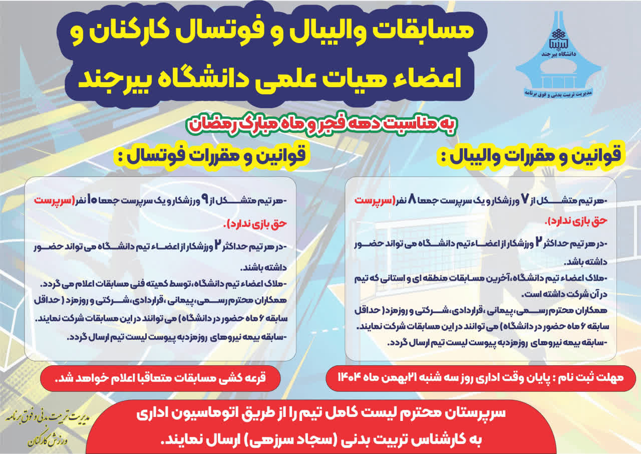 برگزاری مسابقات والیبال و فوتسال کارکنان و اعضا هیأت علمی دانشگاه بیرجند ۱۹ بهمن ۱۴۰۴ | ۰۹:۵۸ کد : ۳۳۳۶۸ اخبار اطلاعیه ها ارسال به دیگران نام شما ایمیل شما ایمیل دریافتکننده ارسال انصراف تعداد بازدید:۶