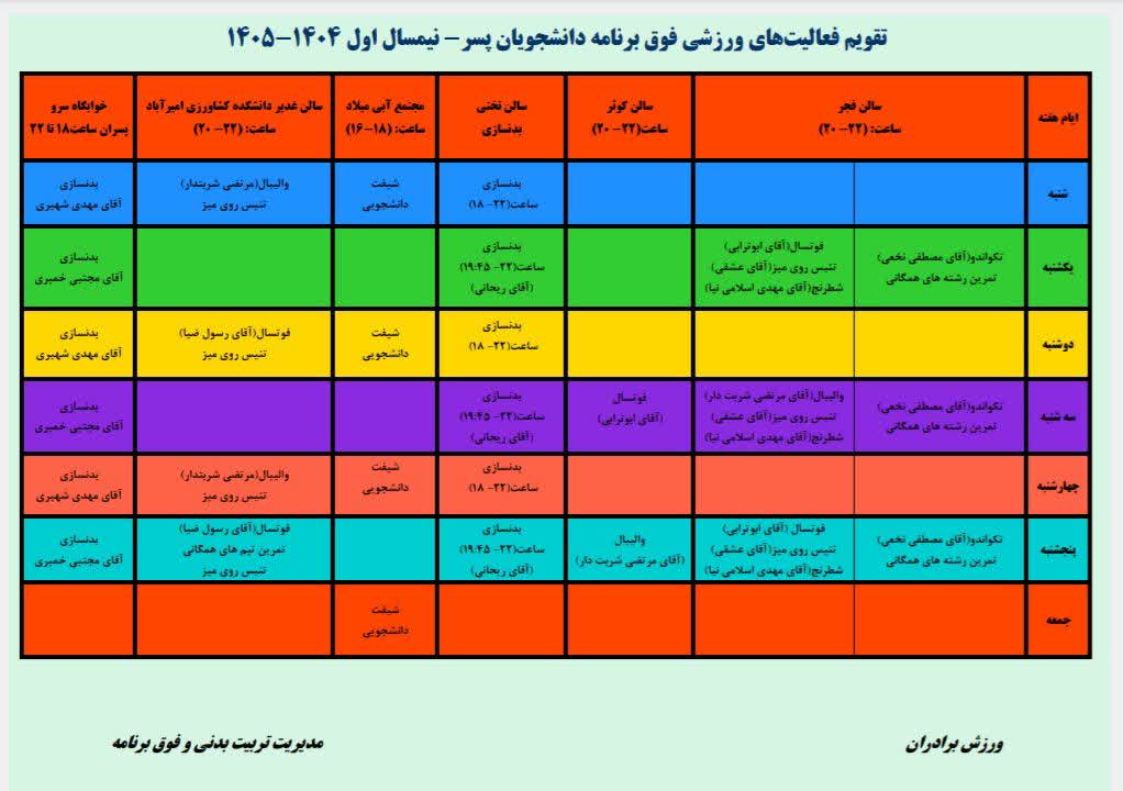 تقویم فعالیت های ورزشی فوق برنامه دانشجویان پسر تعداد بازدید:۴۲۸۰ ارسال به دیگران نام شما ایمیل شما ایمیل دریافتکننده ارسال انصراف