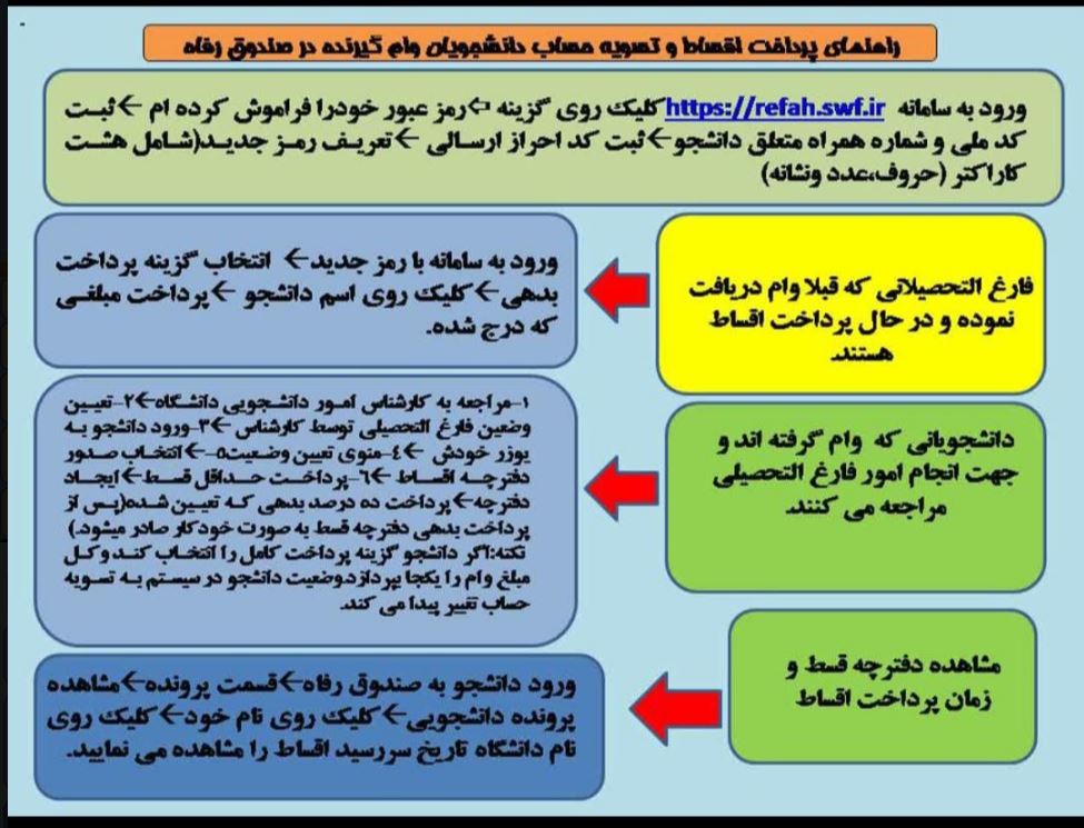 آئیننامه ها و فرآیندها تعداد بازدید:۳۰۷۶ ارسال به دیگران نام شما ایمیل شما ایمیل دریافتکننده ارسال انصراف ردیف نام سند پیوند 1 آیین نامه پرداخت وبازپرداخت وام های دانشجویی دریافت 2 راهنمای پرداخت اقساط وتسویه حساب دانشجویان وام گیرنده در صندوق رفاه دریافت 3 راهنمای جامع تسویه حساب با مرکز خدمات دانشجویی دریافت 4 ضوابط وشرایط باز پرداخت وام های دانشجویی دریافت
