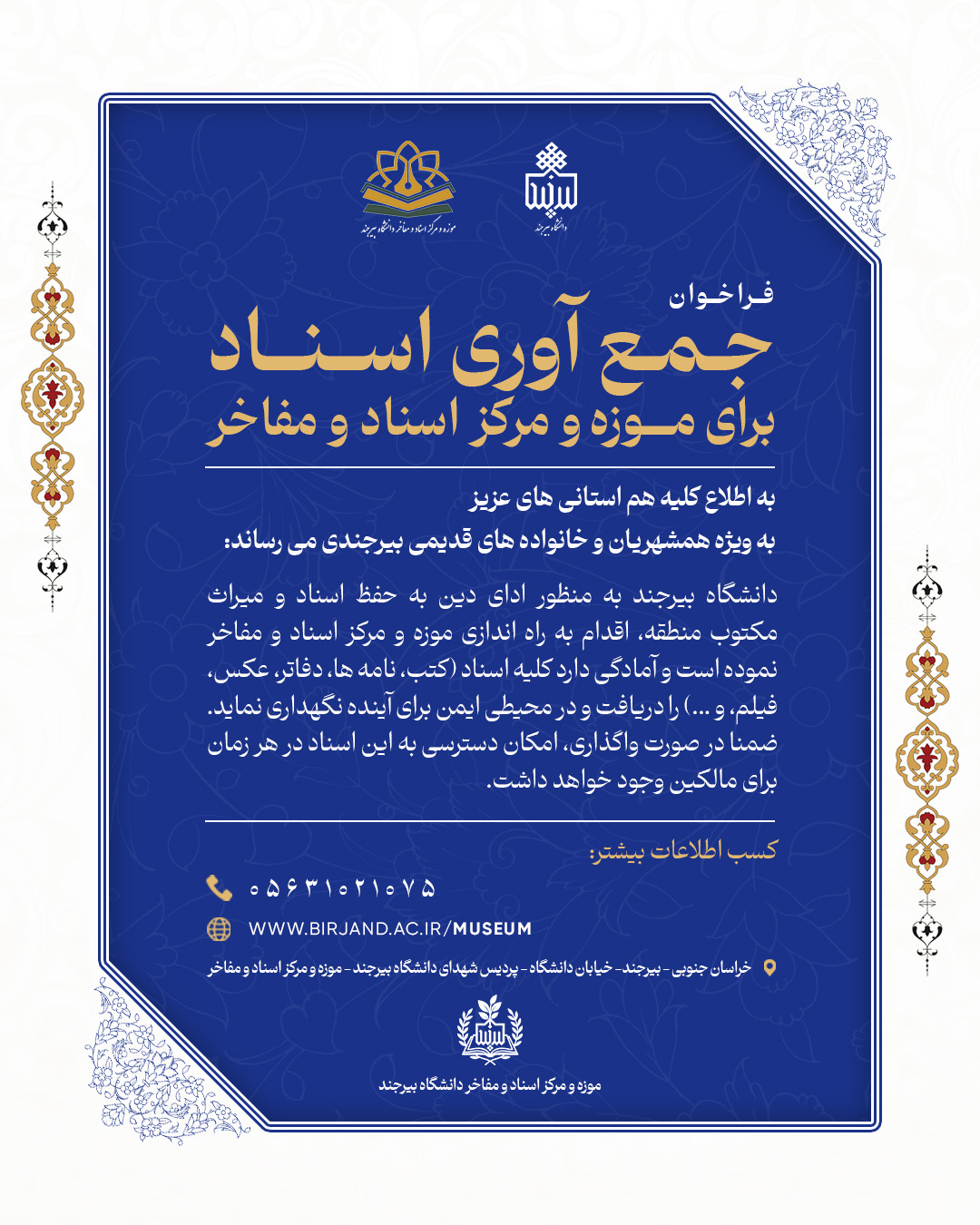 فراخوان فراخوان جمع آوری اسناد موزه و مرکز اسناد و مفاخر دانشگاه بیرجند ۲۹ مرداد ۱۴۰۱ | ۰۸:۱۳ کد : ۱۹۷۱۸ اسلایدر ارسال به دیگران نام شما ایمیل شما ایمیل دریافتکننده ارسال انصراف تعداد بازدید:۸۰۱