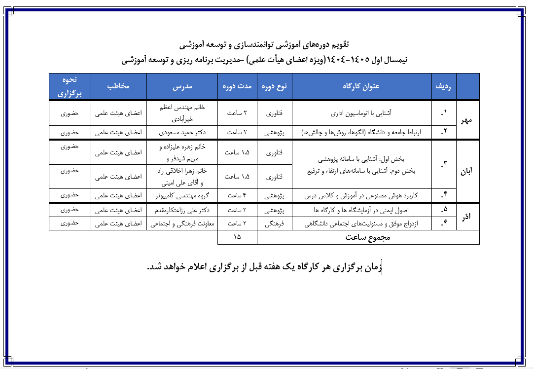 تقویم دوره های آموزشی توانمندسازی و توسعه حرفه ای نیمسال اول سال تحصیلی ۱۴۰۵-۱۴۰۴ ۲۶ مهر ۱۴۰۴ | ۰۸:۵۶ کد : ۳۲۱۴۱ اطلاعیه ها ارسال به دیگران نام شما ایمیل شما ایمیل دریافتکننده ارسال انصراف تعداد بازدید:۴