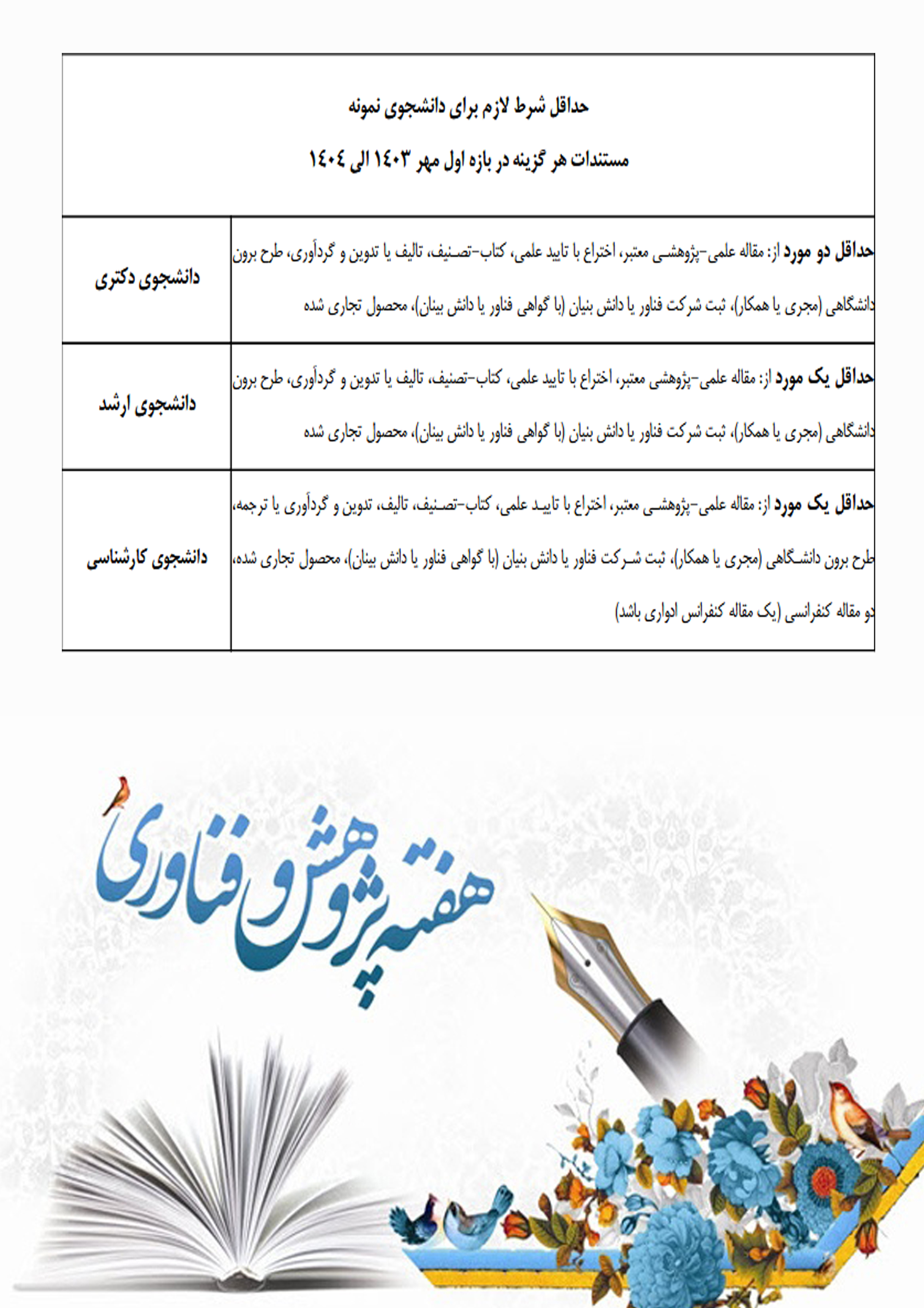دانشجویان متقاضی میتوانند تا تاریخ 27 آبان ماه با ارائه مستندات پژوهشی خود در بازه زمانی مهر 1403 تا مهر 1404، به مسئول پژوهشی دانشکده، در این فرآیند شرکت نمایند. لازم به توضیح می باشد که دانشجویان کارشناسی باید در نیمسال 6 الی 8 تحصیلی باشند.