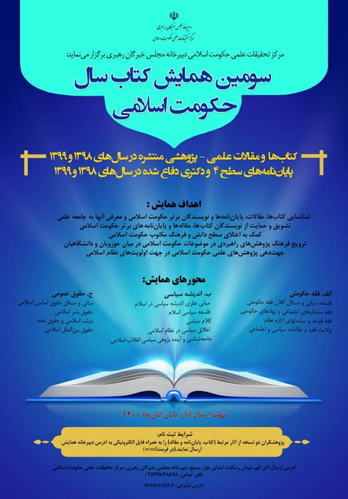 سومین همایش کتاب سال حکومت اسلامی شامل کتابها و مقالههای علمی ـ پژوهشی منتشره در سال های ۱۳۹۸ و ۱۳۹۹ و پایاننامههای سطح ۴ و دکتری دفاع شده در سالهای ۱۳۹۸ و ۱۳۹۹، برگزار خواهد شد.