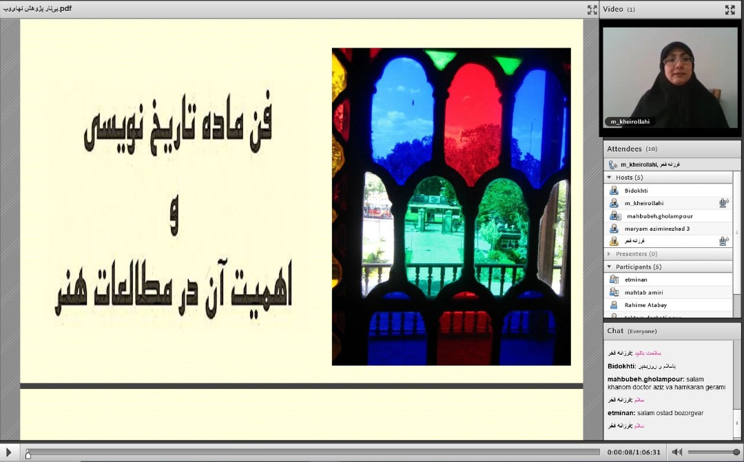 نهمین وبینار گروه صنایع دستی به مناسبت هفته ی پژوهش توسط دکتر مژگان خیرالهی روز سه شنبه مورخ 25 آذرماه 1399 با عنوان «ماده تاریخ نویسی و اهمیت آن در مطالعات هنر» برگزار شد. در این وبینار انواع جداول حساب جمل معرفی شد و به کاربردهای آن در سایر رشته های علمی و هنری؛ از جمله ماده تاریخ نویسی پرداخته شد و نمونه هایی از هر یک ذکر شد.
