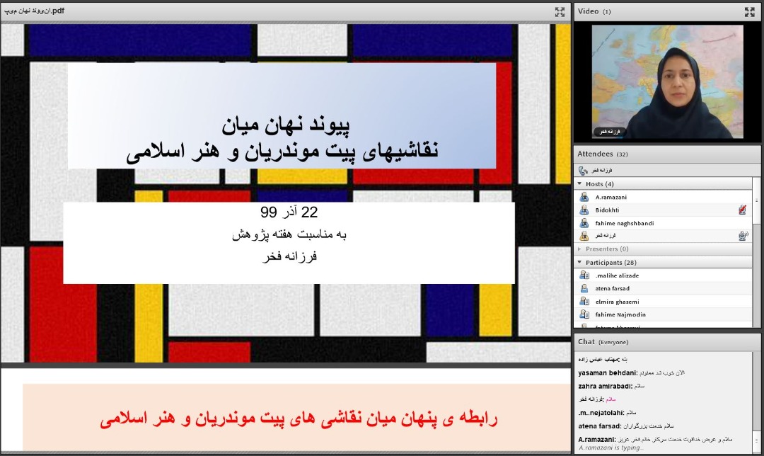 سخنرانی مجازی خانم فخر عضو هیات علمی دانشکده هنر با موضوع پیوند نهان میان نقاشیهای پیت موندریان و هنر اسلامی