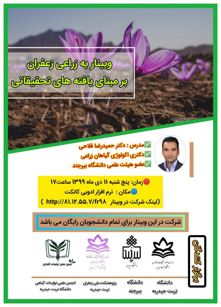 وبینار به زراعی زعفران بر مبنای یافته های تحقیقاتی روز پنج شنبه 1399/10/11 برگزار گردید.