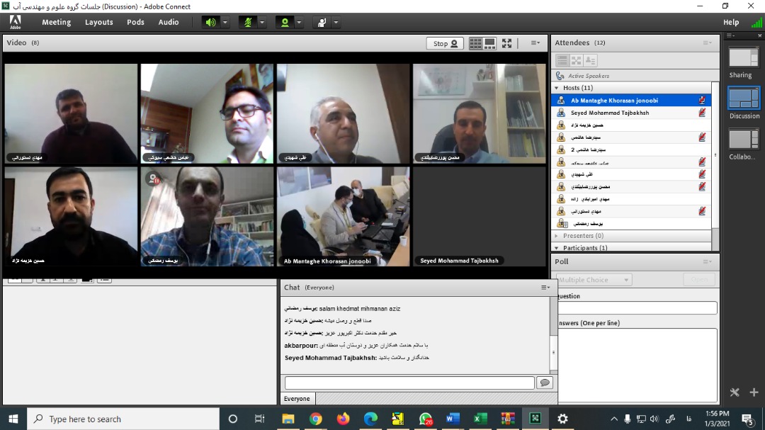 جلسه هماهنگی با مسئولین شرکت آب ومنطقه ای استان خراسان جنوبی و اعضای کمیته تحقیقات این شرکت (آقایان دکتر اکبرپور و دکتر تاج بخش ) در ساعت 13 روز یکشنبه 14 دی ماه برگزار گردید.