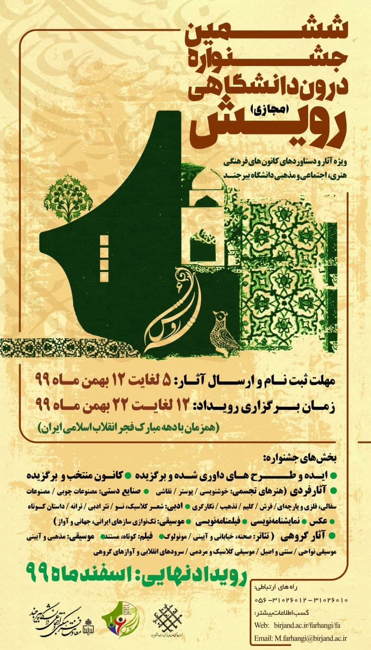 در آستانه ماه غرور آفرین بهمن و همزمان با جشن چهل و دومین فجر انقلاب اسلامی ایران، در قالب فضای مجازی ششمین جشنواره درون دانشگاهی رویش دانشگاه بیرجند برگزار می شود.