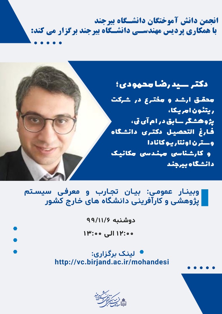 وبینار عمومی: بیان تجارب و معرفی سیستم پژوهشی و کارآفرینی دانشگاه های خارج کشور (دوشنبه ۶ بهمن ۹۹ ساعت ۱۲ ظهر)، دکتر سید رضا محمودی؛ محقق ارشد و مخترع در شرکت ریتئون امریکا، پژوهشگر سابق در ام آی تی، فارغ التحصیل دکتری دانشگاه وسترن اونتاریو کانادا، و دانش آموخته کارشناسی مهندسی مکانیک دانشگاه بیرجند