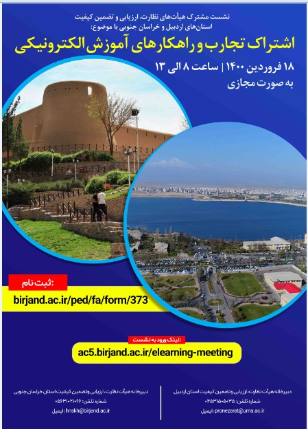 برگزاری نشست مشترک "اشتراک تجارب و راهکارهای آموزش الکترونیکی استان خراسان جنوبی و اردبیل"، چهارشنبه مورخ 1400/01/18 ساعت 8 الی 13، جهت شرکت در نشست مذکور به سامانه پویا مراجعه و ثبت نام بفرمایید.