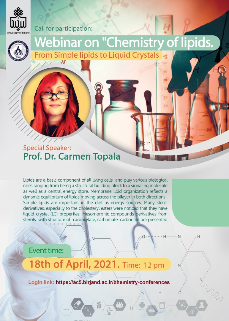 تحت عنوان "Chemistry of liquids, from simple liquids to liquid crystals" ، زمان: یکشنبه ۲۹ فروردین ۱۴۰۰ ساعت ۱۲ ظهر