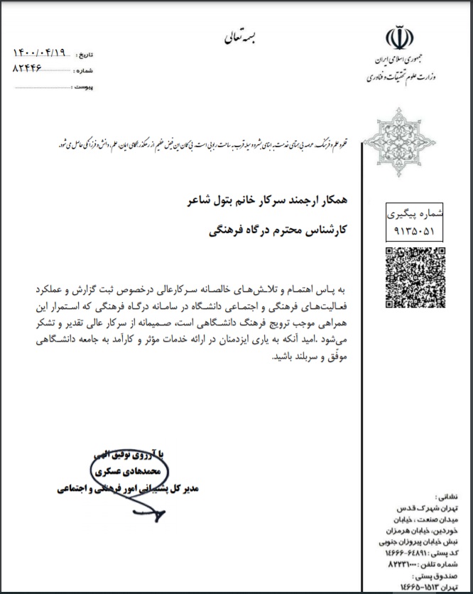 تقدیر و تشکر مدیرکل پشتیبانی معاونت فرهنگی و اجتماعی وزارت علوم، تحقیقات و فناوری از کارشناس فرهنگی دانشگاه بیرجند