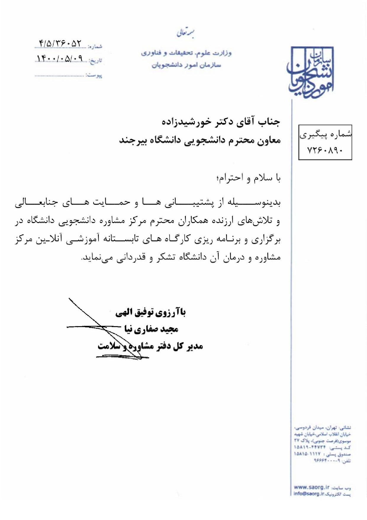 تشکر و قدردانی مدیر کل دفتر مشاوره و سلامت سازمان امور دانشجویان وزارت علوم از همکاران مرکز مشاوره و درمان دانشگاه بیرجند