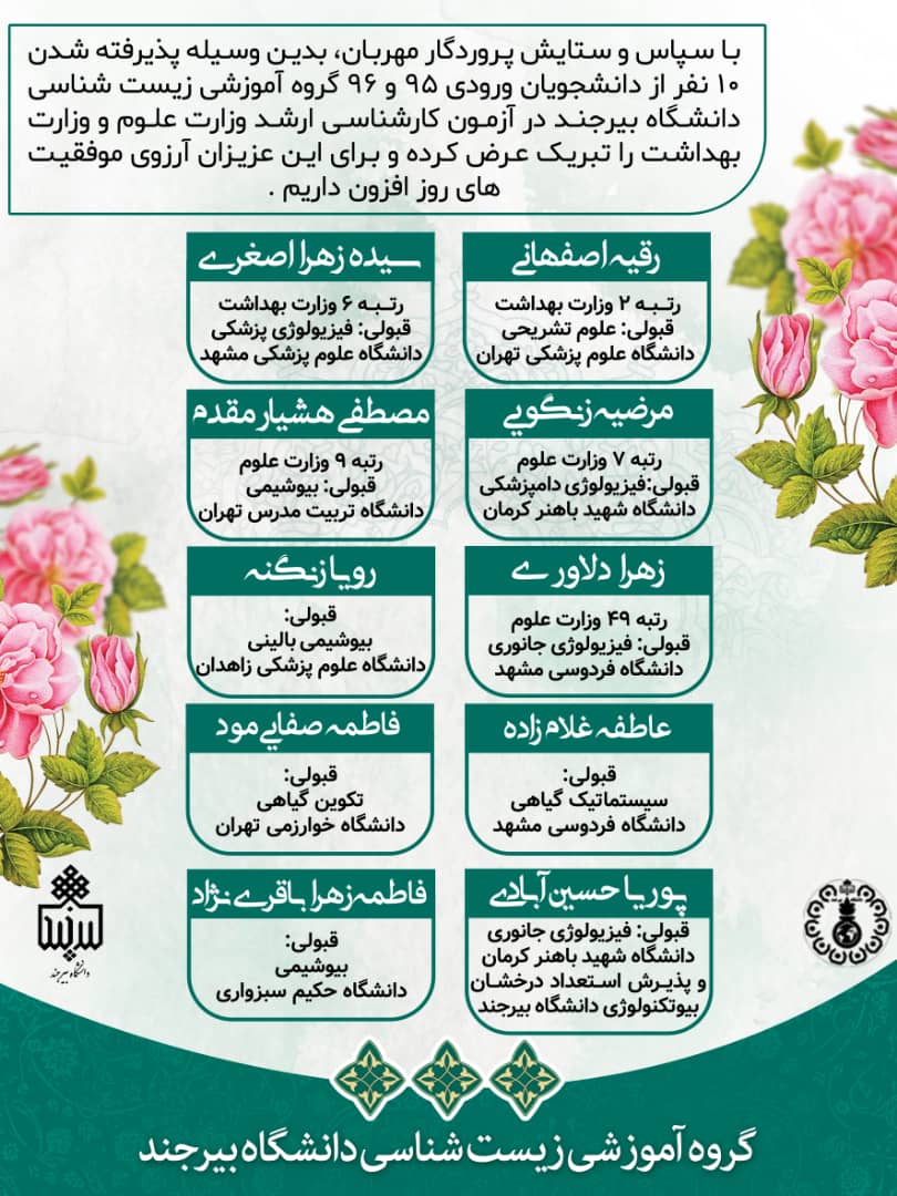 گروه زیست شناسی، این موفقیت را به تمامی این عزیزان تبریک می گوید و برای همه دانشجویان گرامی آرزوی موفقیتهای روزافزون دارد.
