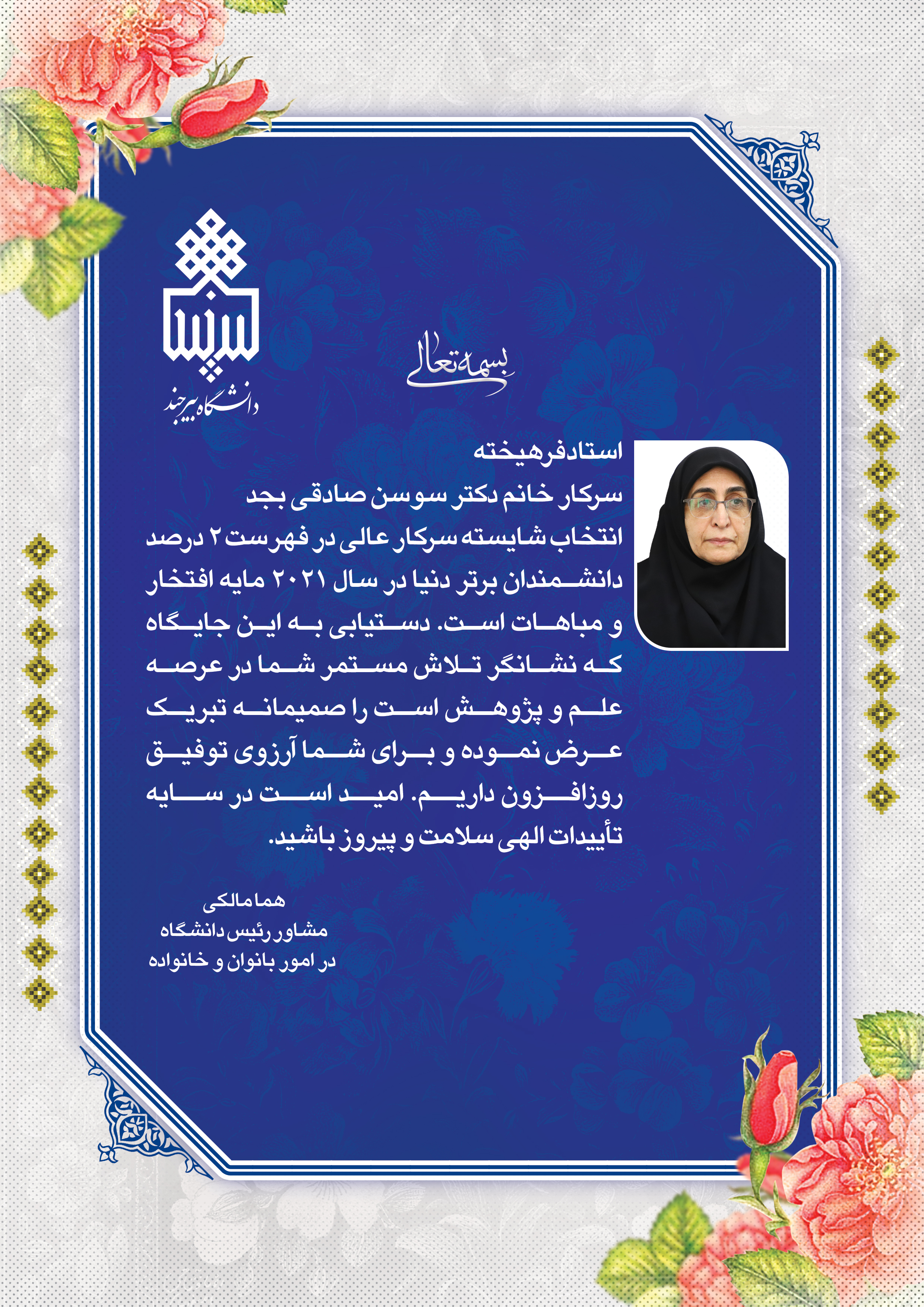 استاد فرهیخته سرکار خانم دکتر سوسن صادقی بجد انتخاب شایسته سرکار عالی در فهرست 2 درصد دانشمندان برتر دنیا در سال 2021 مایه افتخار و مباهات است. دستیابی به این جایگاه که نشانگر تلاش مستمر شما در عرصه علم و پژوهش است را صمیمانه تبریک عرض نموده و برای شما آرزوی توفیق روزافزون داریم. امید است در سایه تأییدات الهی سلامت و پیروز باشید.
