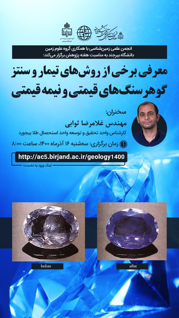 انجمن علمی زمین شناسی با همکاری گروه علوم زمین برگزار می کند: "معرفی برخی از روشهای تیمار و سنتز گوهرسنگ های قیمتی و نیمه قیمتی"