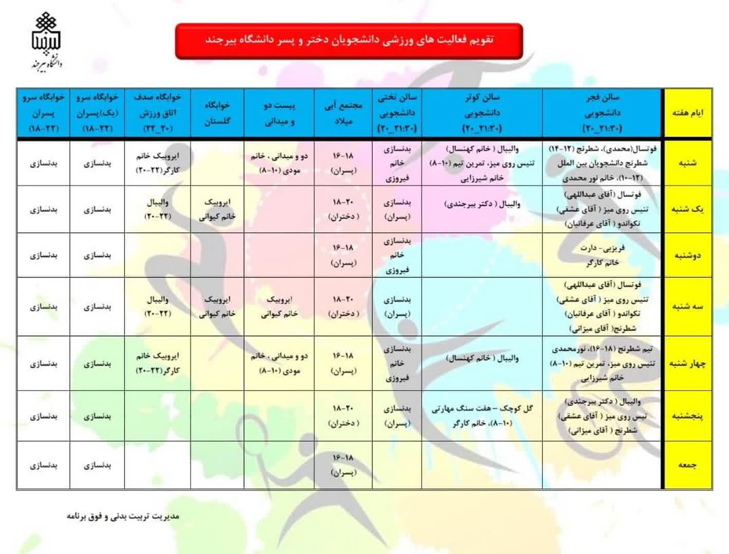 تقویم فعالیت های ورزشی دانشجویان دختر و پسر