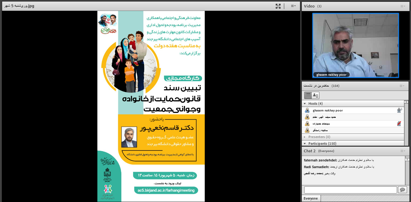 کارگاه مجازی تبین سند قانون حمایت از خانواده و جوانی جمعیت به مناسبت هفته دولت توسط معاونت فرهنگی و اجتماعی دانشگاه و با همکاری مدیریت برنامه، بودجه و تحول اداری و مشارکت کانون مهارت های زندگی و آسیب های اجتماعی دانشگاه بیرجند با حضورجناب آقای دکتر قاسم نخعی پور عضو محترم هیئت علمی گروه حقوق و مشاور حقوقی دانشگاه بیرجند در مورخ شنبه 5 شهریور ماه 1401 از ساعت 13 به مدت 2 ساعت برگزار گردید.در این گفتگو به بیان قوانین و مواد این سند پرداخته شد وهریک از ماده های این قانون به تفکیک تشریح گردید.