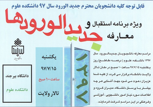 جلسه معارفه دانشجویان جدیدالورود دانشکده علوم روز یکشنبه ۹۷/۰۷/۱۵ ساعت ۱۰ صبح در محل تالار ولایت برگزار خواهد شد.