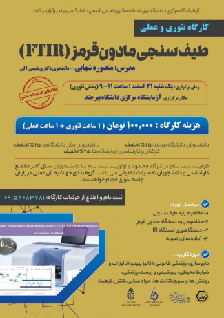 به گزارش روابط عمومی و اطلاعرسانی دانشگاه بیرجند، کارگاه طیف سنجی مادون قرمز FT-IR با حضور دانشجویان، کارشناسان آزمایشگاه و متقاضیان بخش خصوصی برگزار شد. مفاهیم پایه طیف سنجی و دستگاهای مادن قرمز، دستگاه IR و ... از سرفصلای این دوره بود که توسط منصوره شهابی دانشجوی دوره دکتری شیمی آلی ارائه گردید.