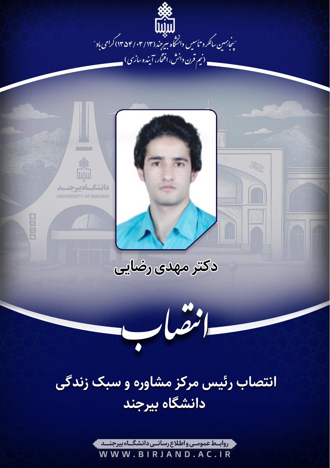 دکتر احمد خامسان، سرپرست دانشگاه بیرجند، طی ابلاغی، دکتر مهدی رضائی، عضو هیأت علمی گروه آموزشی روان‌شناسی را به مدت دو سال به سمت رئیس مرکز مشاوره و سـبک زندگی دانشگاه منصوب کرد.
