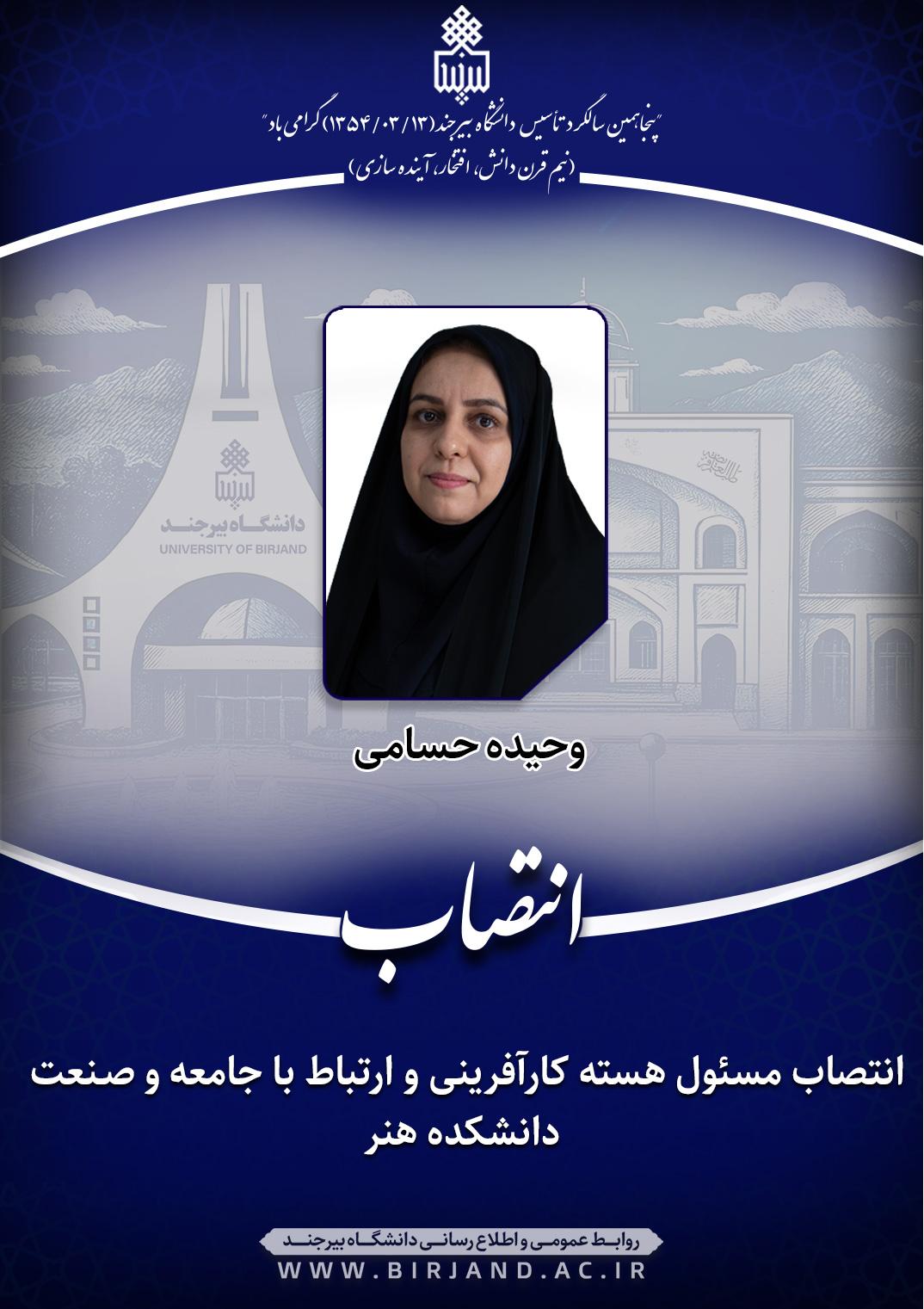 دکتر احمد خامسان، سرپرست دانشگاه بیرجند، با صدور ابلاغی، وحیده حسامی، عضو هیأت علمی گروه آموزشی فرش را به مدت دو سال به سمت مسئول هسته کارآفرینی و ارتباط با جامعه و صـنعت دانشکده هنر منصوب کرد.