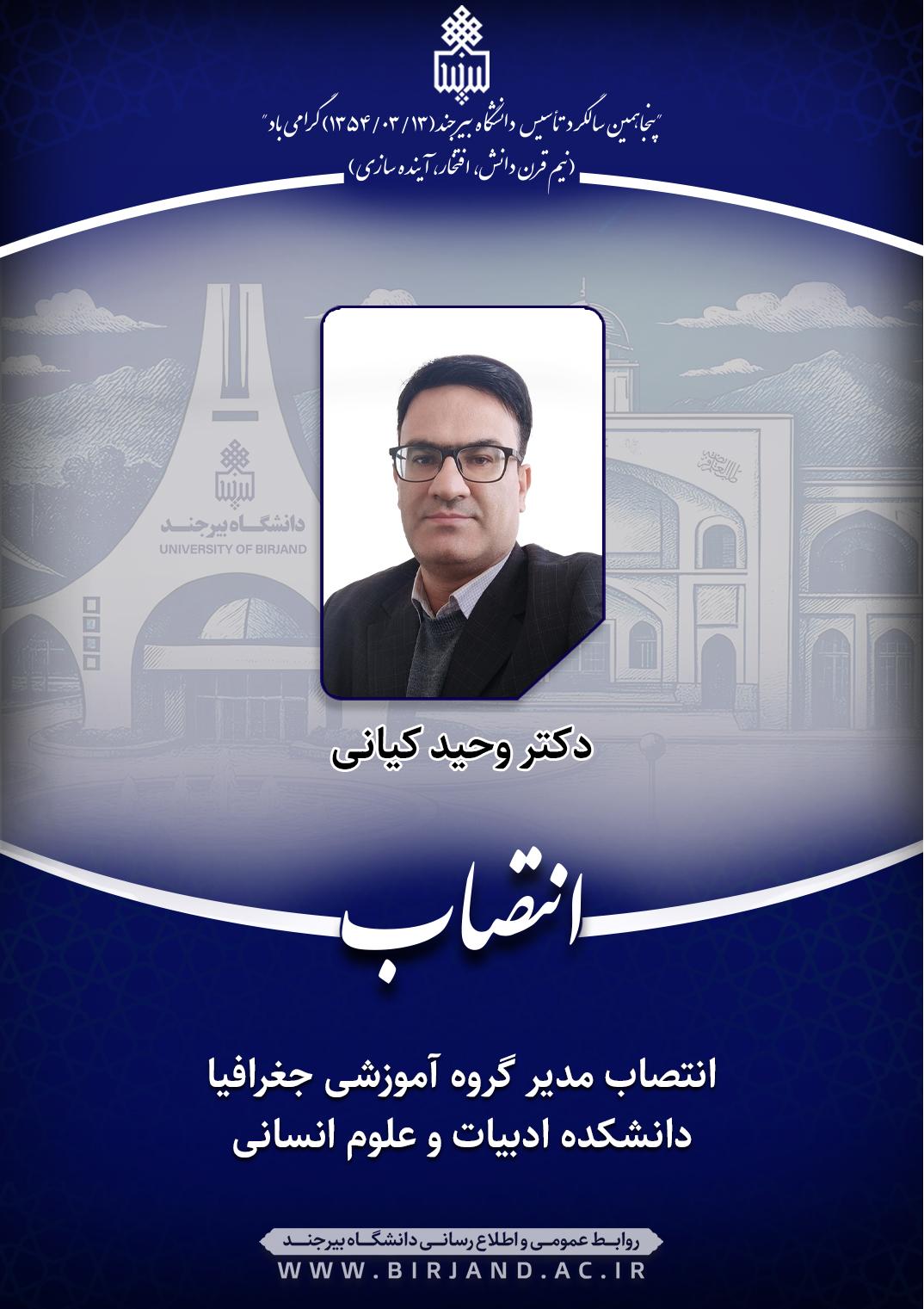 طی ابلاغی از سوی دکتر احمد خامسان، سرپرست دانشگاه بیرجند، دکتر وحید کیانی، عضو هیأت علمی گروه آموزشی جغرافیا، با حفظ سمت آموزشی و پژوهشی، به مدت دو سال به عنوان مدیر گروه آموزشی جغرافیا دانشکده ادبیات و علوم انسانی منصوب شد.