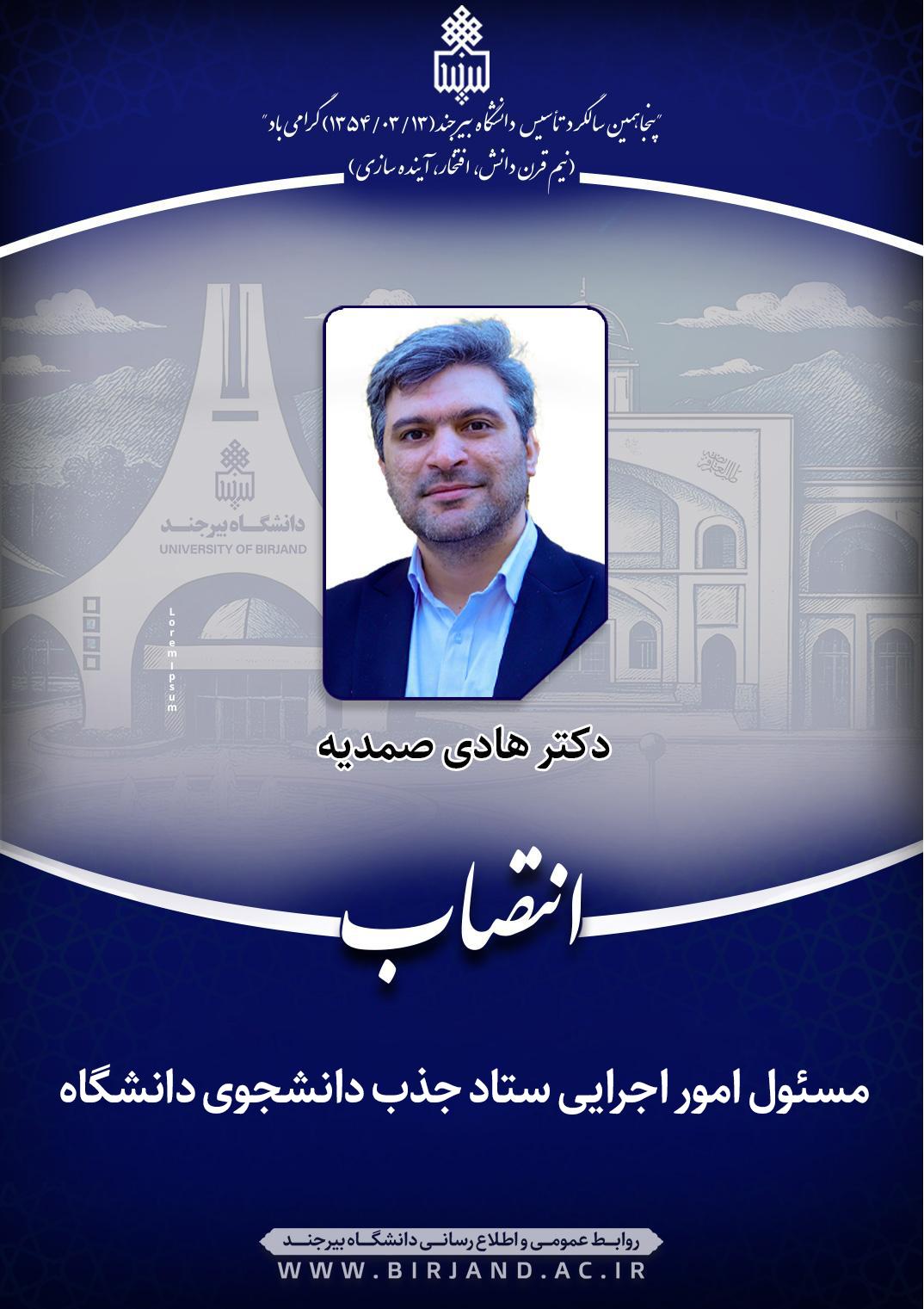 دکتر احمد خامسان، سرپرست دانشگاه بیرجند، به موجب ابلاغی، دکتر هادی صمدیه، عضو هیأت علمی گروه آموزشی روانشناسی را به عنوان مسئول امور اجرایی ستاد جذب دانشجوی دانشگاه منصوب کرد.