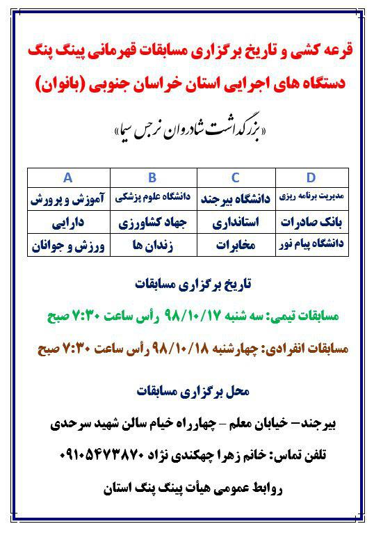 جلسه قرعه کشی مسابقات تنیس روی میز کارکنان خواهر دستگاه های اجرائی خراسان جنوبی مورخ 1398/10/10 با حضور نماینده ورزش کارکنان دانشگاه بیرجند ( فاطمه گنجی ) در محل سالن سرحدی