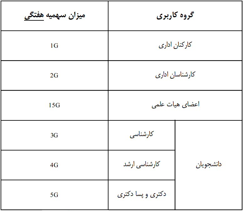 با توجه به افزایش ترافیک اینترنت دانشگاه، سهمیه های جدید ترافیک کاربران از 7 بهمن ماه مطابق با جدول زیر اعمال شده است. لازم به ذکر است که محاسبه ترافیک در شیوه جدید بصورت هفتگی محاسبه شده و ترافیک استفاده نشده به هفته بعد منتقل نخواهد شد. همچنین امکان خرید ترافیک مازاد برای تمامی کاربران فراهم شده است.