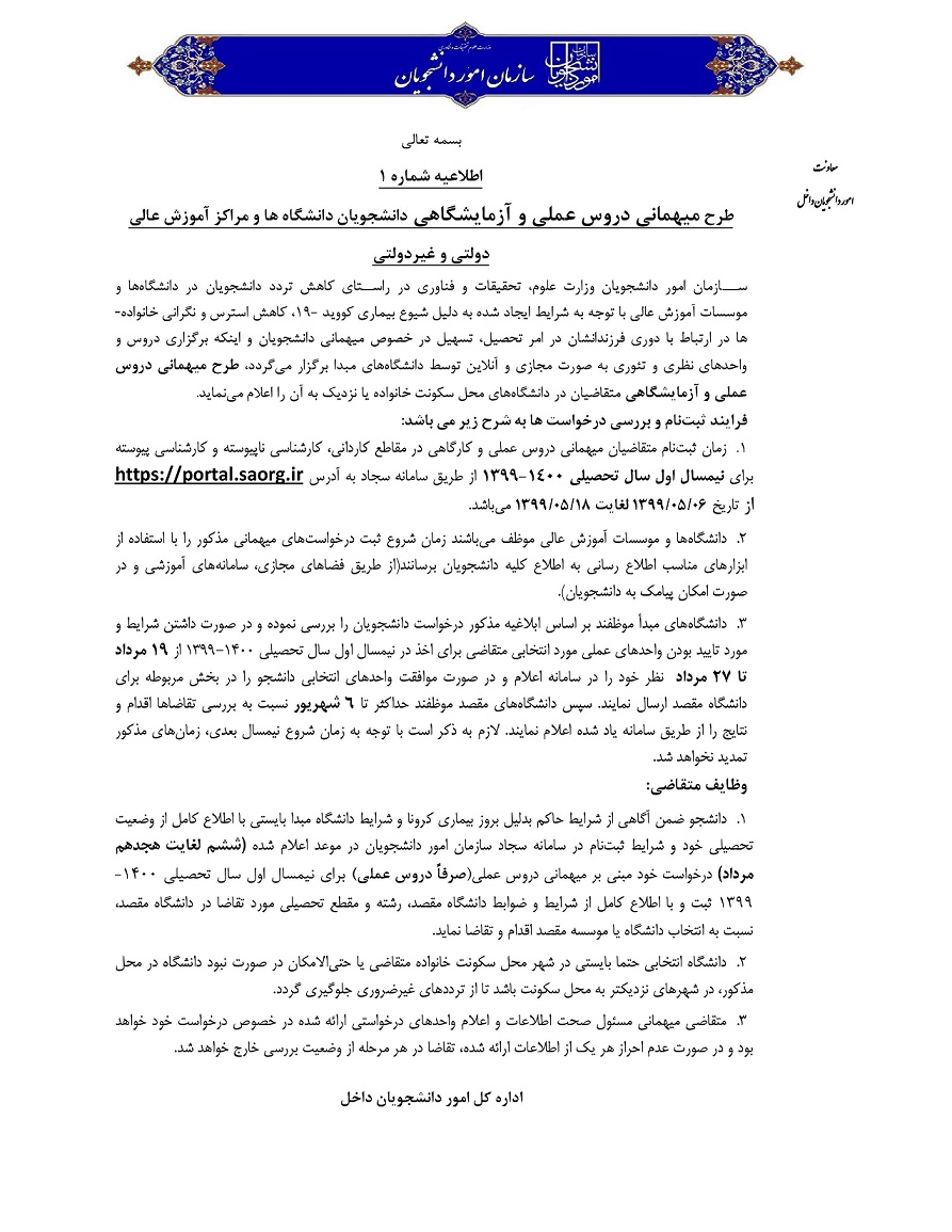 ســـازمان امور دانشجویان وزارت علوم، تحقیقات و فناوری در راســتای کاهش تردد دانشجویان در دانشگاهها و موسسات آموزش عالی با توجه به شرایط ایجاد شده به دلیل شیوع بیماری کووید -۱۹، کاهش استرس و نگرانی خانوادهها در ارتباط با دوری فرزندانشان در امر تحصیل، تسهیل در خصوص میهمانی دانشجویان و اینکه برگزاری دروس و واحدهای نظری و تئوری به صورت مجازی و آنلاین توسط دانشگاههای مبدا برگزار میگردد، طرح میهمانی دروس عملی و آزمایشگاهی متقاضیان در دانشگاههای محل سکونت خانواده یا نزدیک به آن را اعلام مینماید.