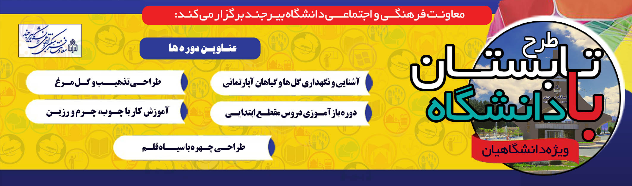 معاونت فرهنگی و اجتماعی دانشگاه بیرجند باهدف پر کردن اوقات فراغت دانشگاهیان و فرزندان عزیز آنان، اقدام به برگزاری طرح "تابستان با دانشگاه" نموده است. علاقمندان می توانند با کلیک روی عنوان هر دوره، ضمن اطلاع از جزئیات، نسبت به ثبت نام در آن دوره نیز اقدام نمایند.