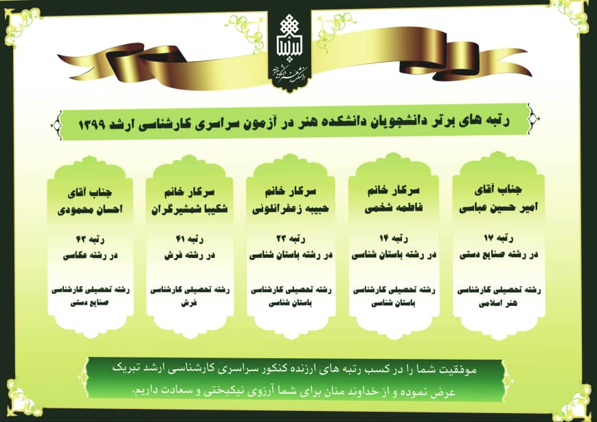 درخشش دانشجویان دانشکده هنر در آزمون سراسری کارشناسی ارشد ۱۳۹۹