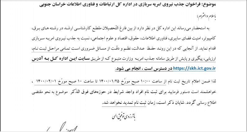 فراخوان جذب نیروی امریه سربازی در اداره کل ارتباطات و فناوری اطلاعات خراسان جنوبی